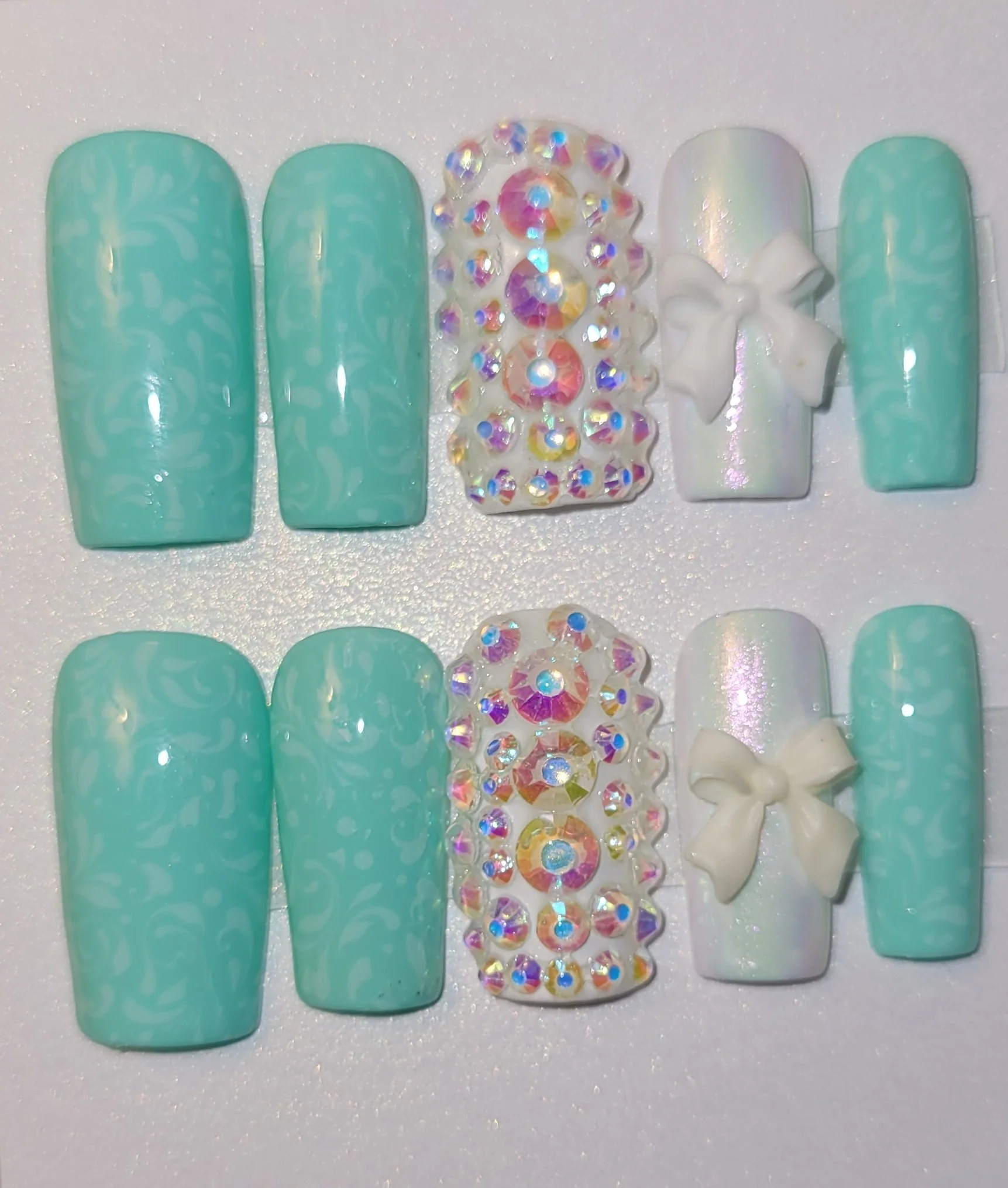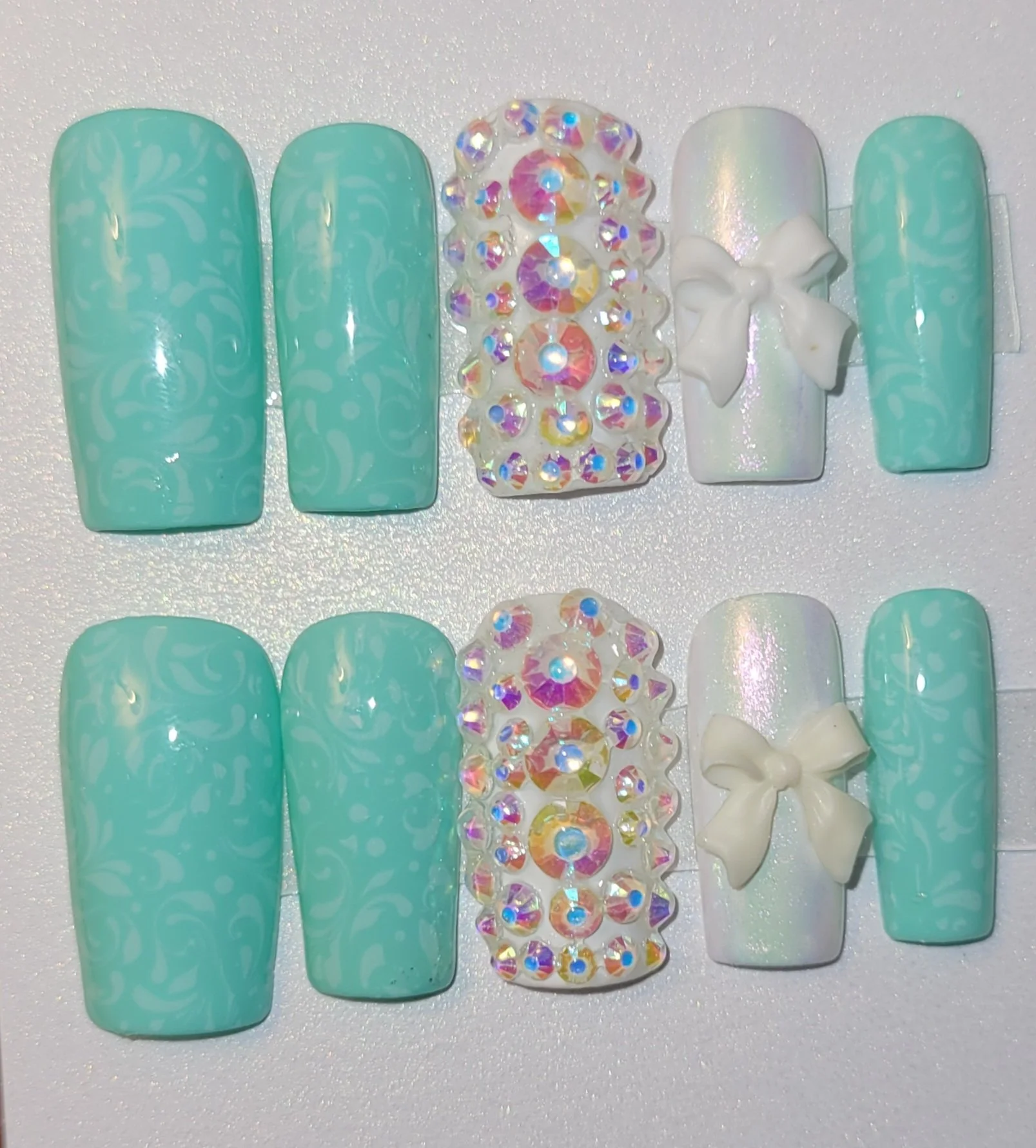Mint and white bling bow press-ons
